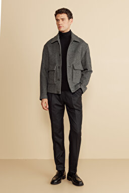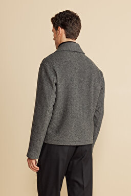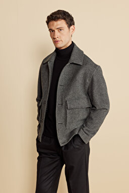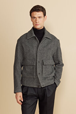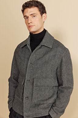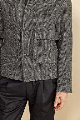 Klasik Yaka Kapak Cep Balıksırtı Desenli Kaban