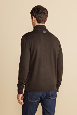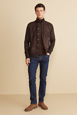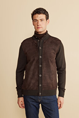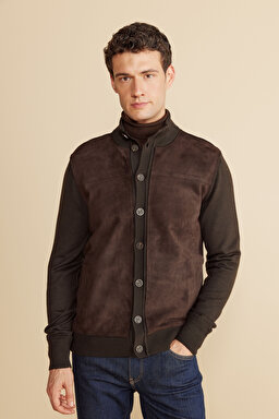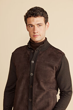 Dik Yaka Düğmeli Önü Süet Triko Mont