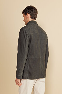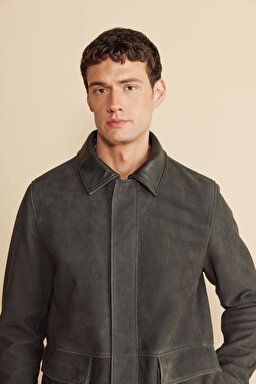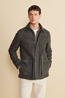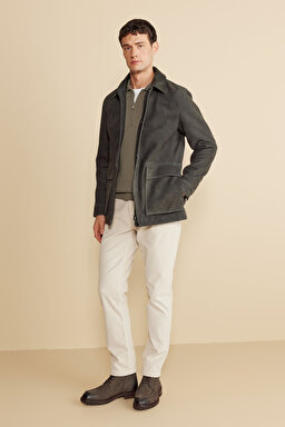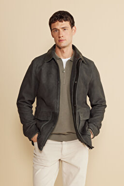 Deri Yaka Detaylı Kapak Cep Süet Mont