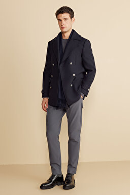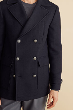 Kruvaze Metal Düğmeli Yün Karışımlı Kaban