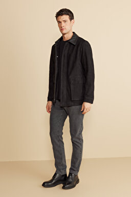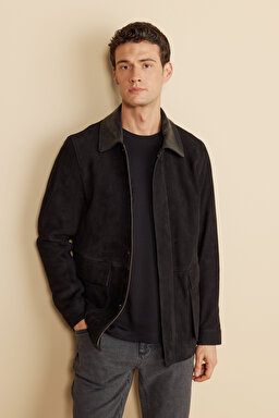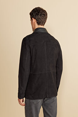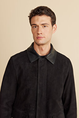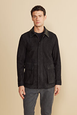 Deri Yaka Detaylı Kapak Cep Süet Mont