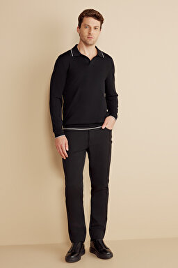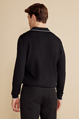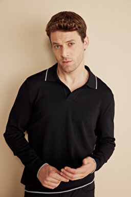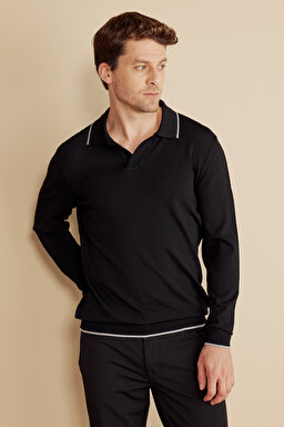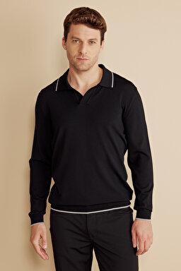Düğmesiz Polo Yaka Etek ve Kol Ucu Çizgili Rayon Kazak