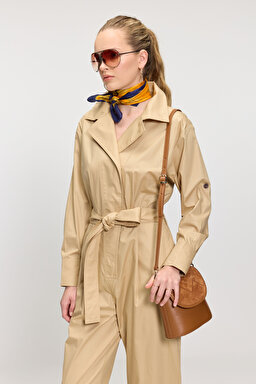 Pamuk Karışımlı Beli Kuşaklı Kruvaze Pileli Tulum