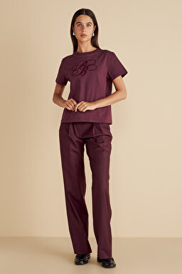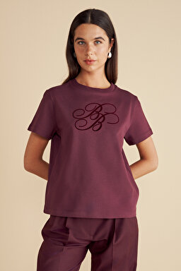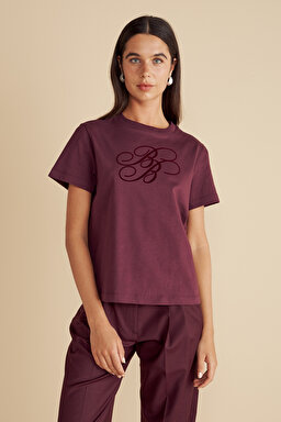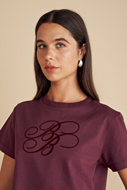 %100 Pamuk Bisiklet Yaka Flok Baskılı T-shirt