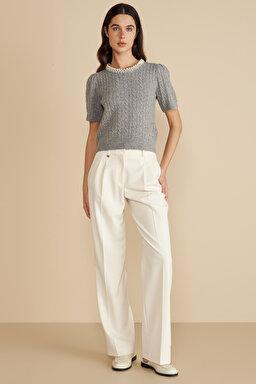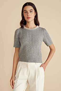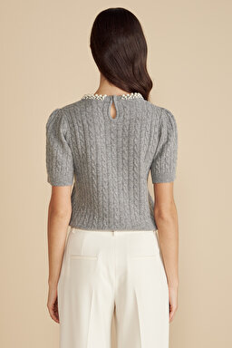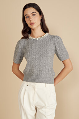 Yün Karışımlı Yakası İncili Saç Örgü Kısa Kol Kazak