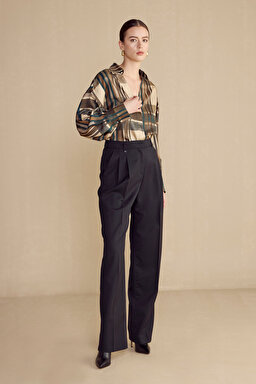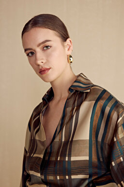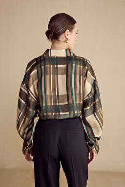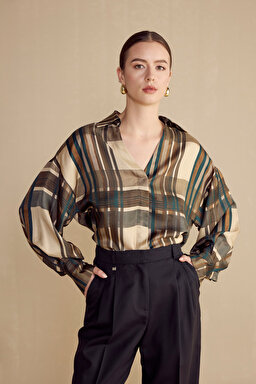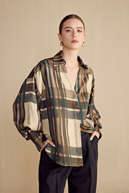 100% İpek Kaçık Yaka Ekose Desen Gömlek