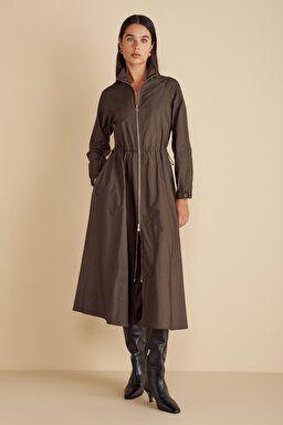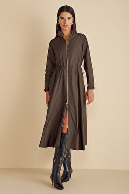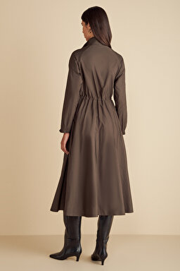 Önü Fermuarlı Beli Büzgülü Tafta Gömlek Elbise