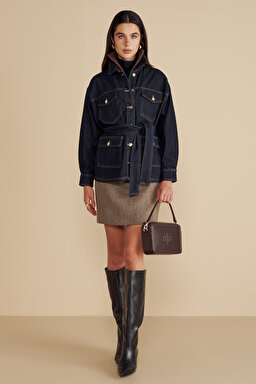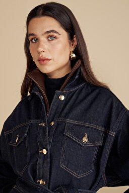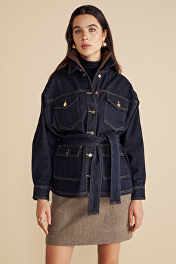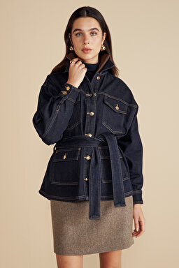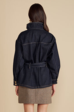 %100 Pamuk Metal Düğmeli Beli Kuşakli Denim Ceket