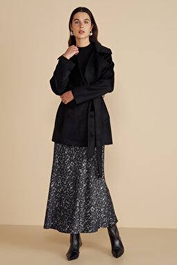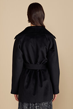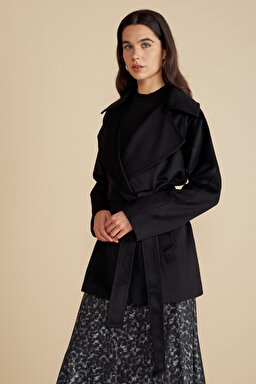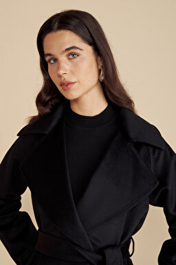 %100 Yün Geniş Yakalı Beli Kuşaklı Kısa Kaban