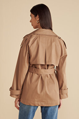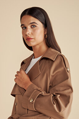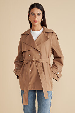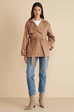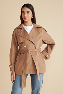 %100 Pamuk Beli Kuşaklı Logo Astarlı Kısa Trençkot